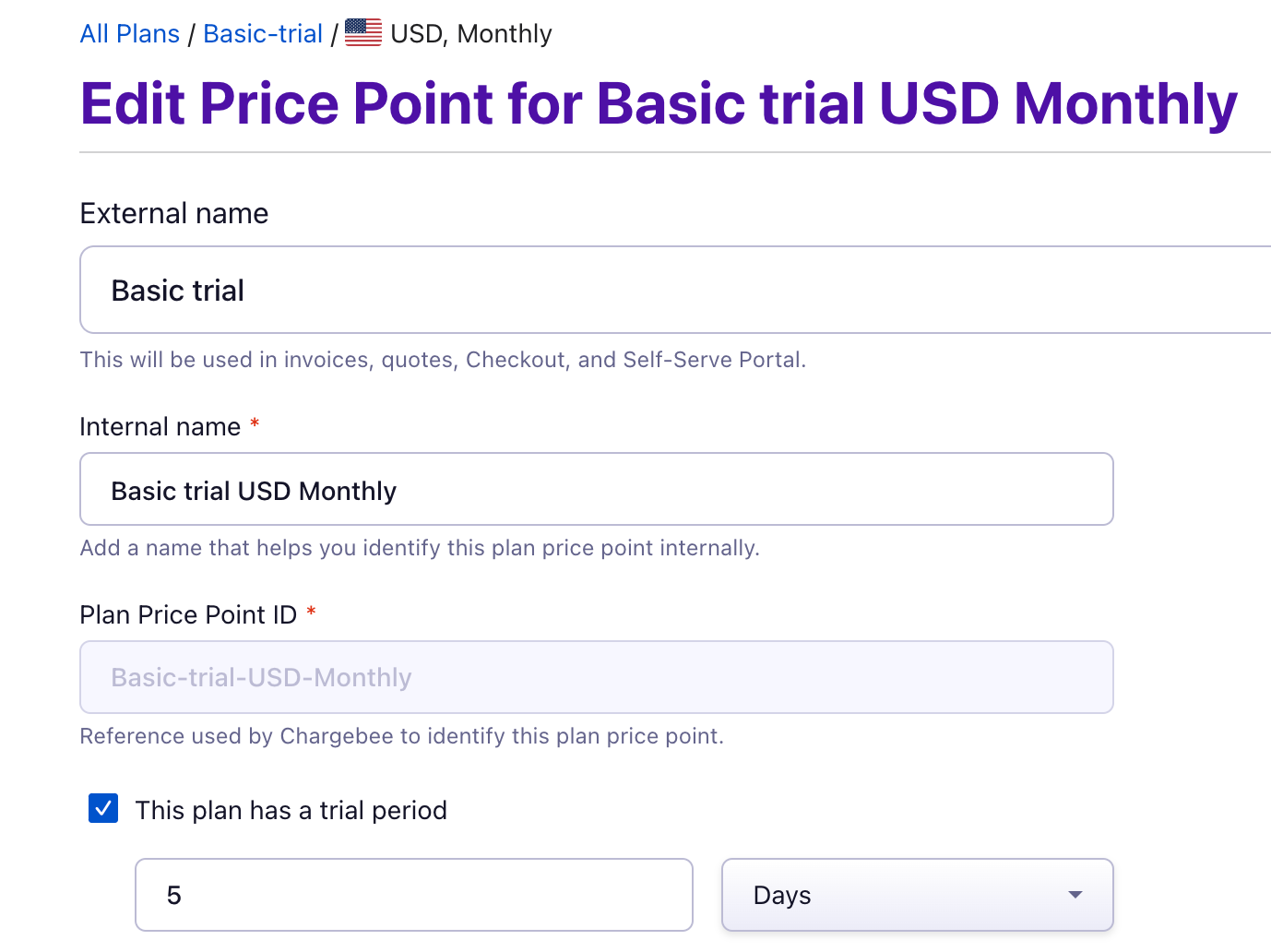 You can change the trial period using the Edit plan option which will take effect for the new subscriptions and the existing subscription remains with the previous configurations. In PC 2.0, you can edit the trial period from the Price point level.