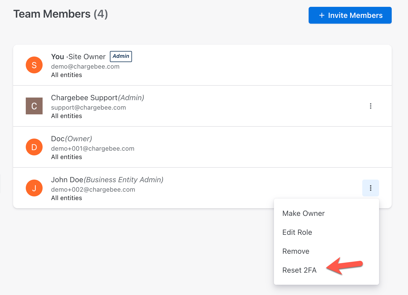Contact Chargebee Support if you or your administrator are not able to reset your 2FA.