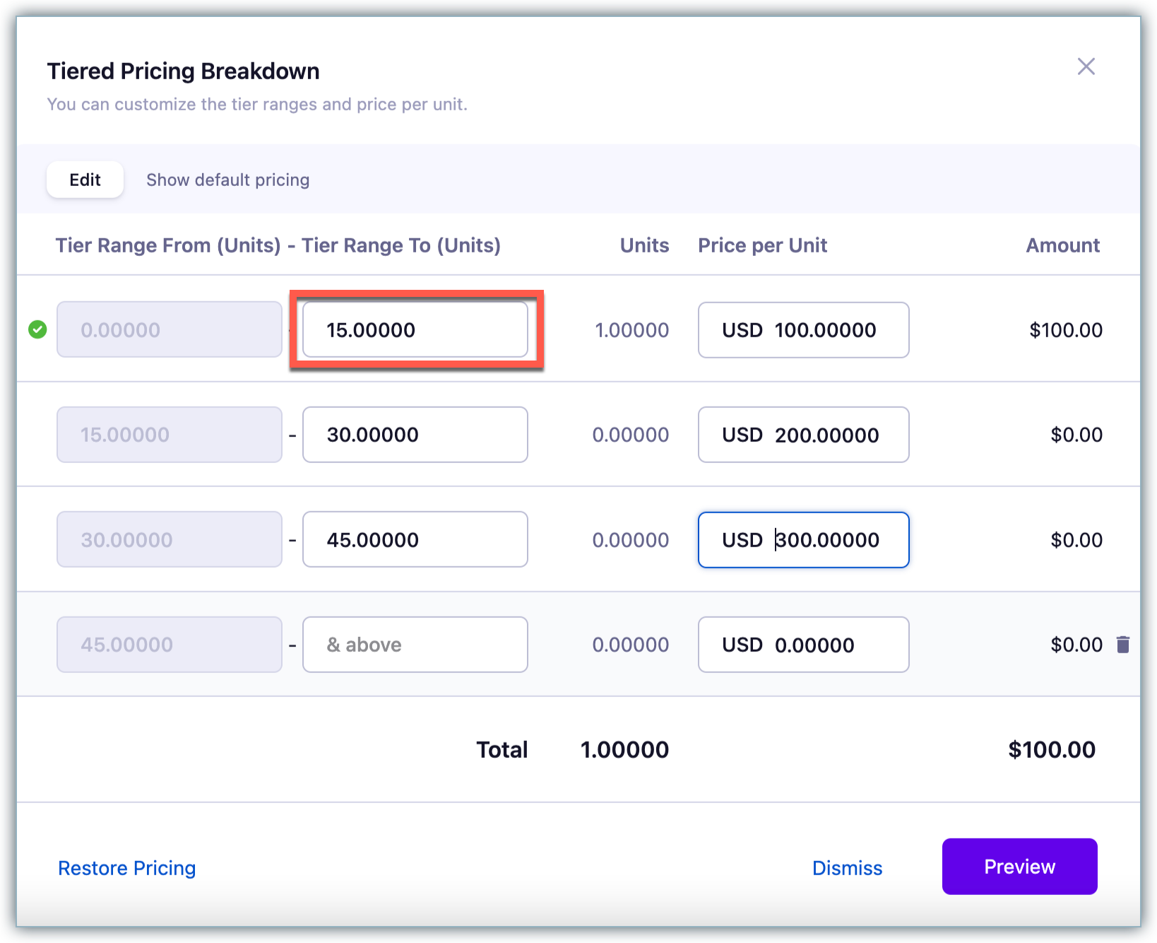Step 3: On the Tiered Pricing breakdown popup - Edit tab, the tier ranges are displayed with the lower(From) and upper(To) limits along with the price per unit for each tier range.