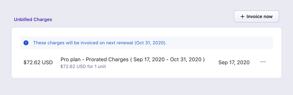 The section also shows the date on which the charges would be invoiced (same as the subscription renewal date).
